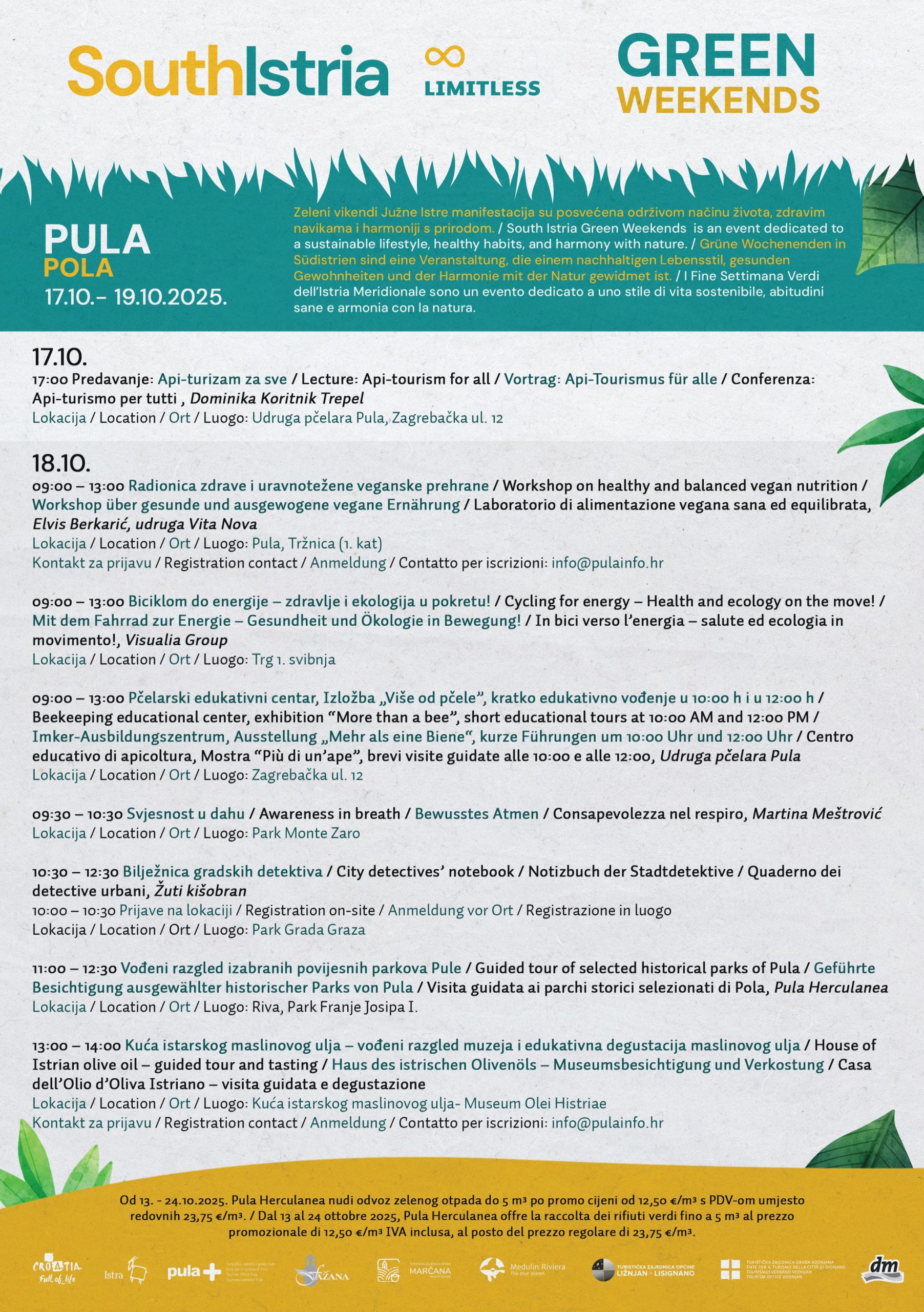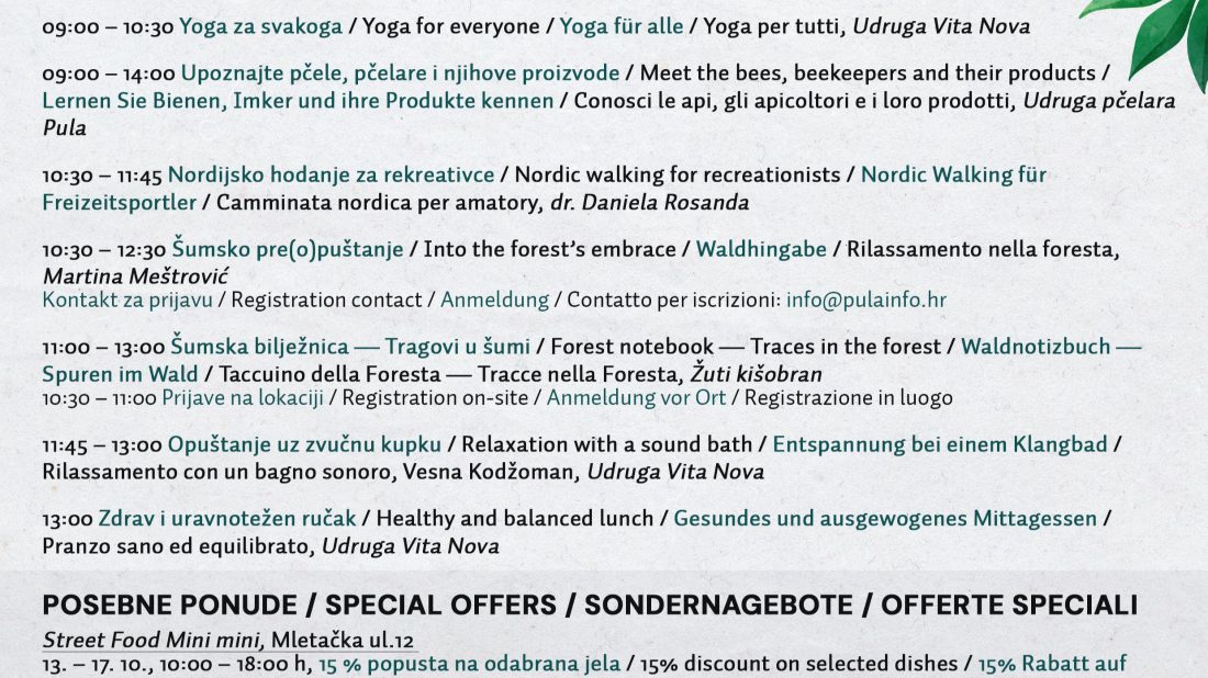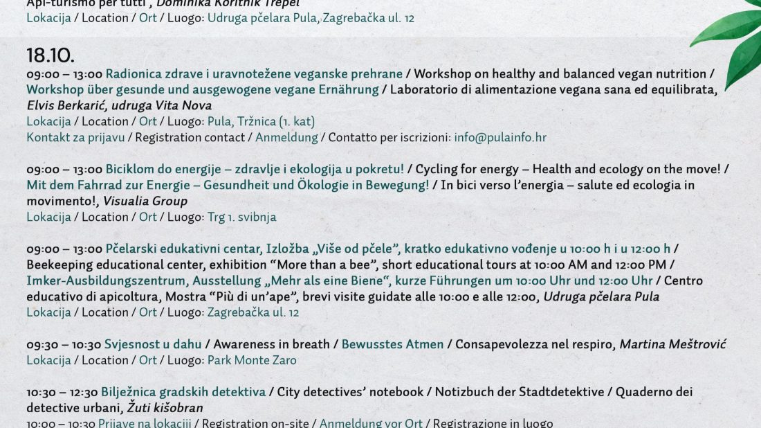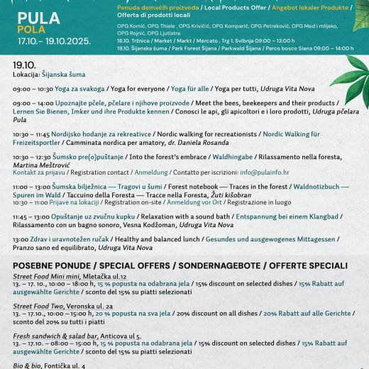 Za kraj je Sanja Cinkopan Korotaj spomenula i dio programa u suradnji sa Visualia Group-om na Tržnici gdje će u subotu posjetitelji moći isprobati biciklirati i na taj način paliti struju. Zatim program u suradnji s Pula Herculaneom koji će za posjetitelje osigurati vođeni razgled izabranih povijesnih parkova Pule. Osim toga, Herculanea Pula nudit će građanima od 13. do 24. listopada odvoz zelenog otpada do 5 m³ po promotivnoj cijeni od 12,50 €/m³ s PDV-om umjesto redovnih 23,75 €/m³.
