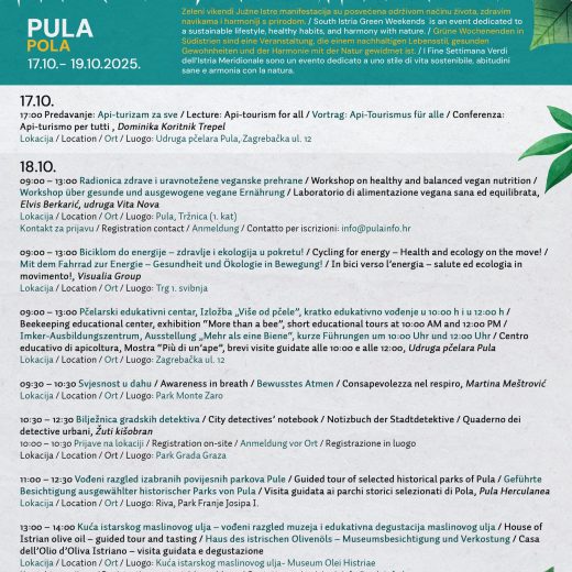 Danas je u prostoru Turističke zajednice Pula održana tiskovna konferencija na kojoj je predstavljen program manifestacije Zeleni vikendi južne Istre, koju su organizirale sve turističke zajednice Klastera južne Istre, a koja će se u Puli održati od 17. do 19. listopada 2025. Manifestacija je posvećena održivom načinu života, zdravim navikama i harmoniji s prirodom, a kroz tri dana obuhvatit će niz radionica, predavanja, rekreativnih aktivnosti, program za djecu te ponudu domaćih proizvoda. Klaster južne Istre je za manifestaciju Zeleni vikendi dobio i sredstva od Hrvatske turističke zajednice.