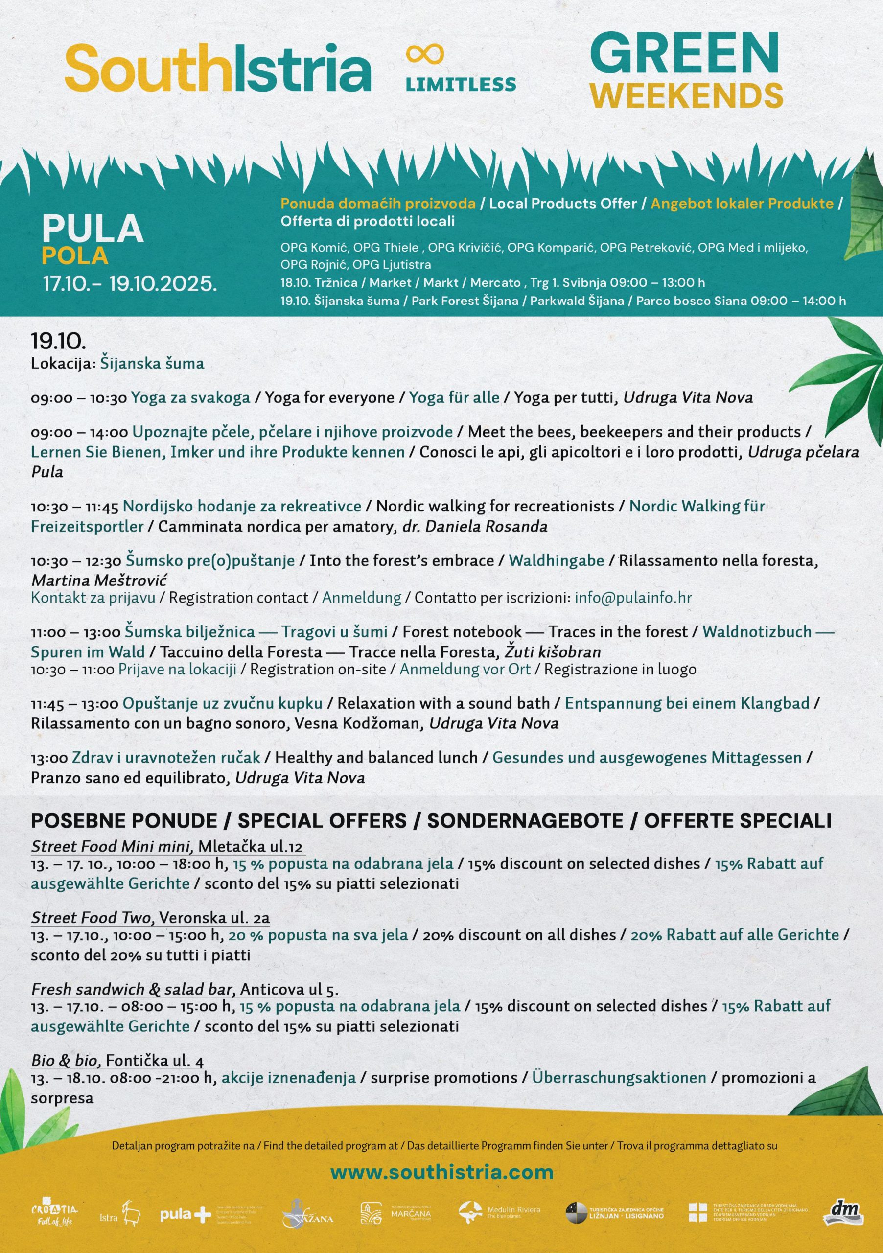 Spomenute su i posebne ponude koje kroz tjedan od 13. do 17. listopada uključuju popuste i akcije u gradskim ugostiteljskim objektima i trgovinama zdrave hrane. Redom su to Street Food Mini mini , Street Food Two, Fresh sandwich & salad bar te Bio & bio.
