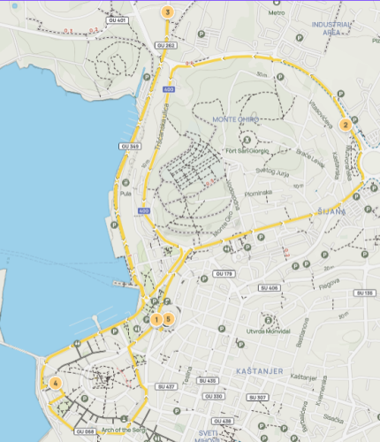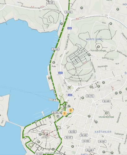 Skreće se zatim Rivom desno Ulicom 119. Brigade i Partizanskim putom uzbrdo — okret za 180° 5m prije raskrižja za skretanje za Pizzeriu Tivoli — Partizanski put — zapadni kolnik Ulicoe 119. Brigade — Riva — Flaciusova — ulazak na Forum — izlaz kroz pro. Svetog Nikole — Flaciusova — Danteov trg — Anticova — zapadni kolnik Laginjina — zapadni kolnik Giardini — Carrarina. Iz Carrarine skreću pod 90 ° desno u Amfiteatarsku — skretanje desno pod 90 ° i ulazak u Arenu — CILJ.